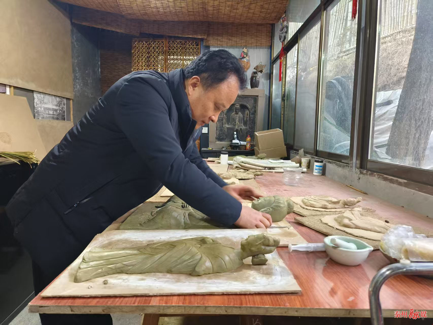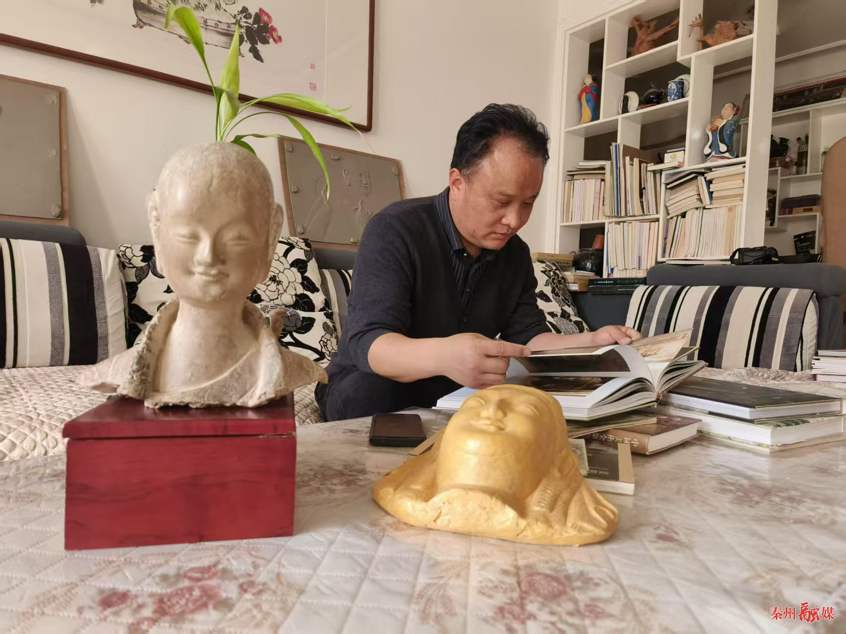 一走進(jìn)天水泥塑非遺傳承人何彥云的工作室,藝術(shù)氣息迎面撲來,古樸的院落,透出沁心的靜逸。走進(jìn)屋內(nèi),造型各異、大小不一的泥塑作品擺滿了陳列架,它們或夸張變形,或惟妙惟肖。臨摹麥積山石窟的各種的“薄肉塑壁畫”也懸掛在墻壁上,這些作品每一件都栩栩如生,仿佛注入了靈魂,透出何彥云對泥塑藝術(shù)的熾熱追求。