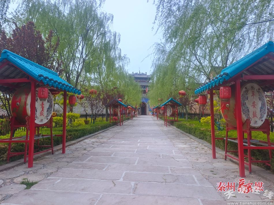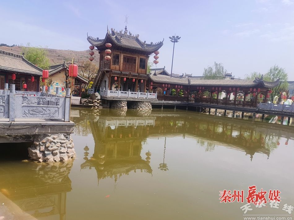 距秦州市區(qū)40余公里的平南鎮(zhèn)蘇灣民俗莊園,占地500畝,“一館、一坊、二園、六區(qū)”的布局錯(cuò)落有致。踏入莊園,仿古城樓巍峨矗立,飛檐翹角、雕梁畫棟間明清建筑藝術(shù)的韻味撲面而來。古色古香的門樓與潺潺流水相映成趣,檐下紅燈籠隨風(fēng)搖曳,宛如一幅靜謐的田園水墨畫卷。