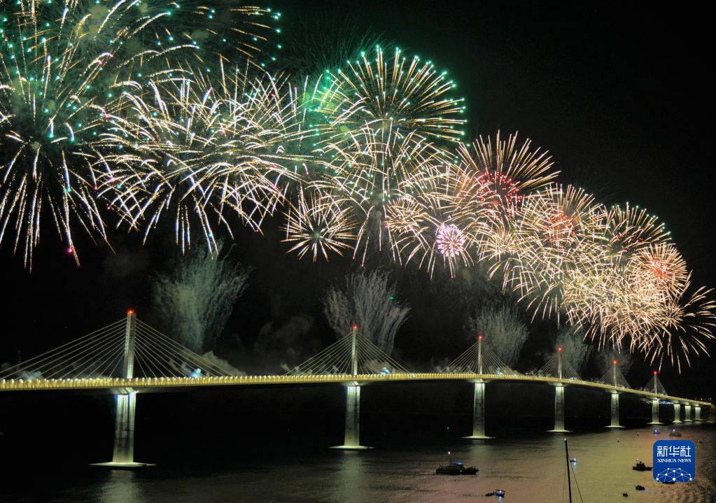 這是在克羅地亞科馬爾納拍攝的由中企承建的佩列沙茨大橋通車儀式上的焰火表演(2022年7月26日攝)。新華社記者 李學(xué)軍 攝