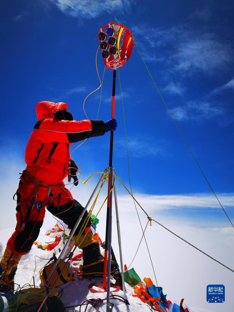 2020珠峰高程測量登山隊(duì)隊(duì)員在珠穆朗瑪峰峰頂開展測量工作(2020年5月27日攝)。新華社特約記者 扎西次仁 攝