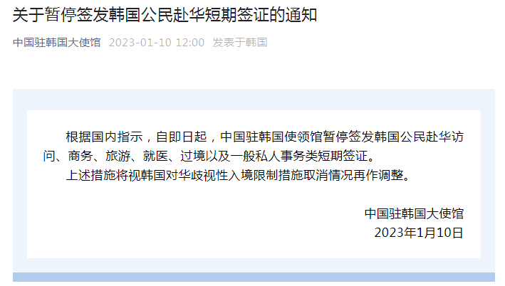 根據(jù)國(guó)內(nèi)指示,自即日起,中國(guó)駐韓國(guó)使領(lǐng)館暫停簽發(fā)韓國(guó)公民赴華訪問(wèn)、商務(wù)、旅游、就醫(yī)、過(guò)境以及一般私人事務(wù)類短期簽證。