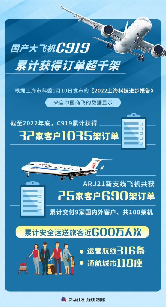 根據(jù)上海市科委1月10日發(fā)布的《2022上?萍歼M(jìn)步報(bào)告》,來(lái)自中國(guó)商飛的數(shù)據(jù)顯示,2022年12月,C919大型客機(jī)首架機(jī)交付首家用戶(hù)東方航空公司,邁出市場(chǎng)運(yùn)營(yíng)“第一步”。截至2022年底,C919累計(jì)獲得32家客戶(hù)1035架訂單。
