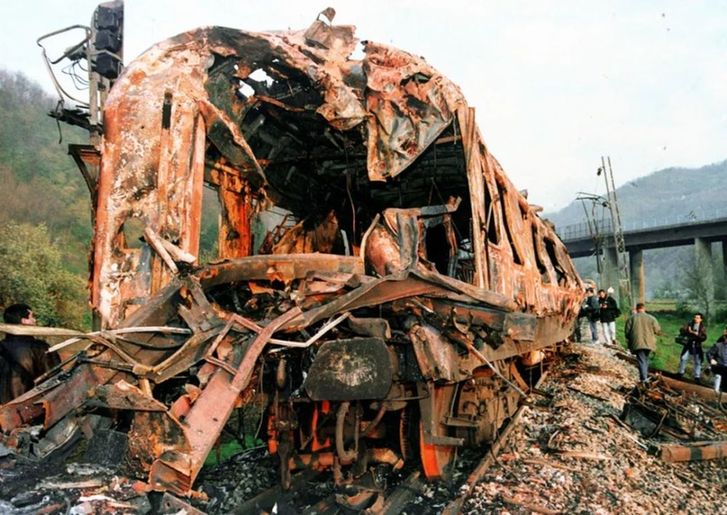 1999年3月24日,以美國為首的北約向南斯拉夫聯(lián)盟開始發(fā)動大規(guī)?找u,武力干涉科索沃危機。資料照片顯示被北約飛機炸毀的火車。新華社發(fā)