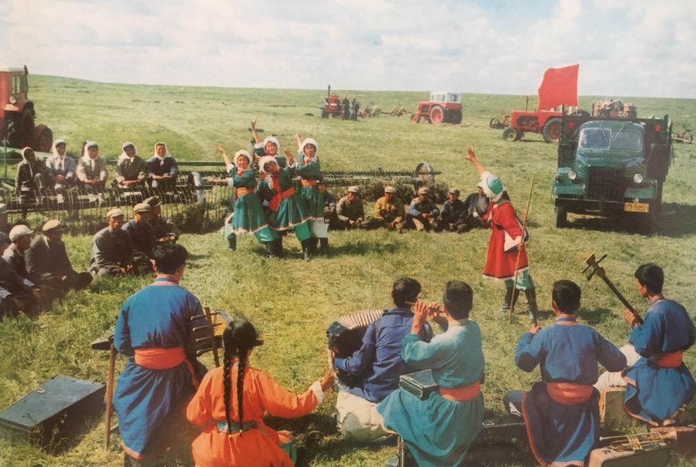 20世紀(jì)70年代,內(nèi)蒙古錫林郭勒盟烏蘭牧騎隊(duì)員在草原上為牧民演出。新華社發(fā)