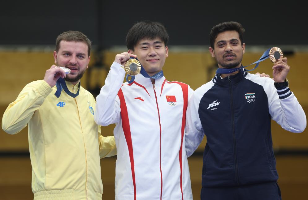 8月1日,冠軍中國(guó)選手劉宇坤(中)、亞軍烏克蘭選手庫(kù)里什(左)和季軍印度選手庫(kù)薩萊在頒獎(jiǎng)儀式上。新華社記者 趙丁喆 攝