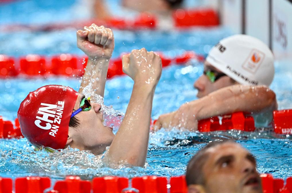 7月31日,中國選手潘展樂在比賽后慶祝。當日,在巴黎奧運會游泳項目男子100米自由泳決賽中,中國選手潘展樂以46秒40的成績奪冠并打破世界紀錄。新華社記者 杜宇 攝