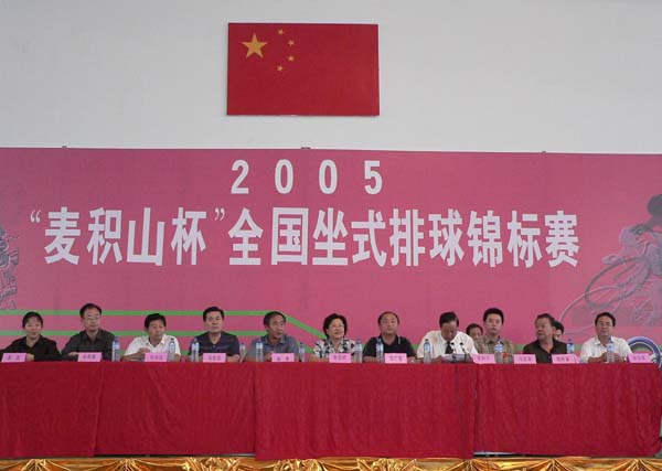 圖為各路記者在采訪2005年“麥積山杯”全國(guó)坐式排球錦標(biāo)賽頒獎(jiǎng)儀式