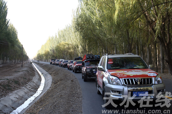 圖1、我們的車隊行進在阿克蘇的防沙林中,塔克拉瑪干沙漠多了一處難得的綠洲。