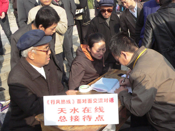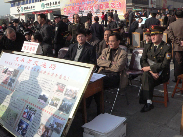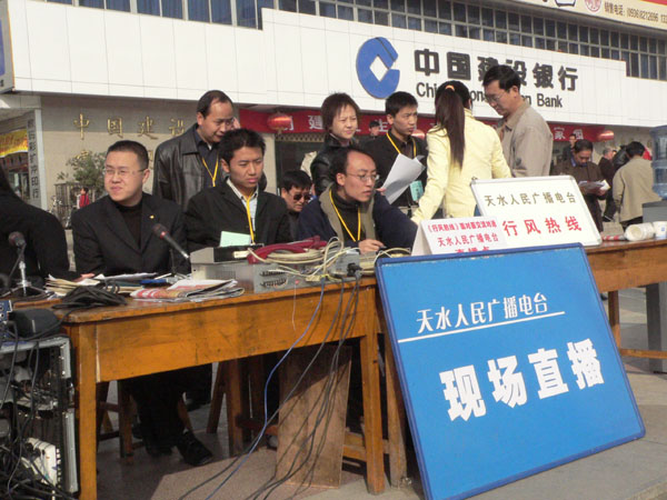 10月23日上午,天水人民廣播電臺《行風(fēng)熱線》大型現(xiàn)場直播活動(dòng)在市中心廣場舉行,本次活動(dòng)由天水市糾風(fēng)辦、天水市廣播電影電視局主辦。27個(gè)職能部門和11家熱點(diǎn)單位負(fù)責(zé)人走出直播間,來到廣場,本著“對等、對面、對話,交談、交流、交心”的精神,零距離與廣大群眾接觸見面,現(xiàn)場聽取大家對黨風(fēng)、政風(fēng)、行業(yè)作風(fēng)的意見!缎酗L(fēng)熱線》大型現(xiàn)場直播活動(dòng)在我市和全省都是首次。