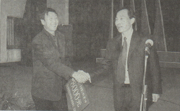 圖為王鴻生(右)將獎(jiǎng)金交給受贈(zèng)單位代表。 記者 張樹平 張娟 攝
