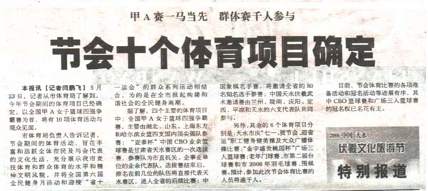 本報(bào)訊【記者閆鵬飛】 5月23日,記者從市體育局了解到,今年節(jié)會(huì)期間的體育項(xiàng)目已經(jīng)確定,以全國(guó)甲A女子籃球四強(qiáng)爭(zhēng)霸賽為首,將有10項(xiàng)體育活動(dòng)與觀眾見(jiàn)面。