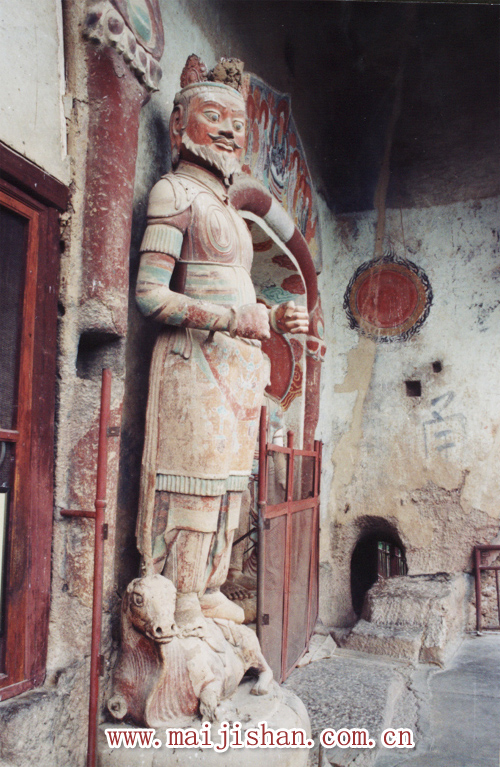 麥積山5號窟,名曰“牛兒堂”,中間龕門前有一摩首羅漢,站在一只臥著的牛犢身上。這個牛兒,塑造得相當動人:圓圓的眼睛,頑皮地注視前方,腳雖屈著,卻似乎要躍起的樣子,最出色的是把一只牛犢所具有的稚氣和活潑表現(xiàn)出來了,相傳,這頭牛犢是一頭神牛,動一動就會地震,天王雙腳有力地踩住了牛犢的脊背。從此,牛犢再也不能活動和吼叫。