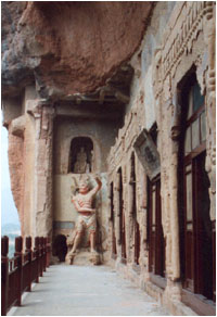 麥積山第43號洞窟,是個奇特的所在,它的外形為崖閣式,模仿漢代宮殿結(jié)構(gòu),出檐,有尾、額枋、斗拱八角型或四角型立柱。據(jù)說這是當年藏放魏文后靈柩的地方,這里記載著一段哀怨的歷史故事。魏文后,名乙弗氏,很得魏文帝敬重。她共生兒女12個、皆早夭亡,惟留下二太子,在秦州任刺史,稱武都王。東魏和西魏對立,東魏強大而西魏弱小,東魏的實權(quán)掌握在高歡手里,而西魏卻由宇文泰控制。東魏和西魏為了加強統(tǒng)治,都竭為拉攏北方的強敵柔然國。先是東魏以公主嫁給柔然國主,宇文泰強迫西魏文帝娶柔然國公主郁久為后。廢乙氏到麥積山出家為尼。生性暴戾,心腸偏窄的郁久對乙佛氏一直不肯放過,魏文帝只好敕令乙佛氏自盡。乙佛氏飲恨自盡后,太子武都王在麥積山鑿龕葬母,稱為“寂陵”。后來,魏文帝駕崩,眾大臣按其遺囑,將乙弗氏墓遷出麥積山,與魏文帝合葬永陵。