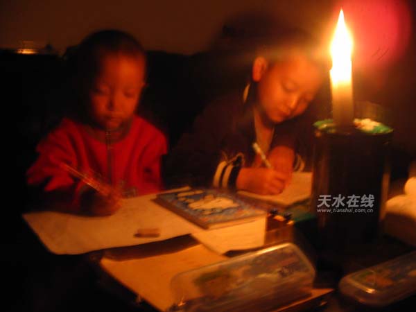 兩個(gè)孩子在蠟燭下寫作業(yè)
