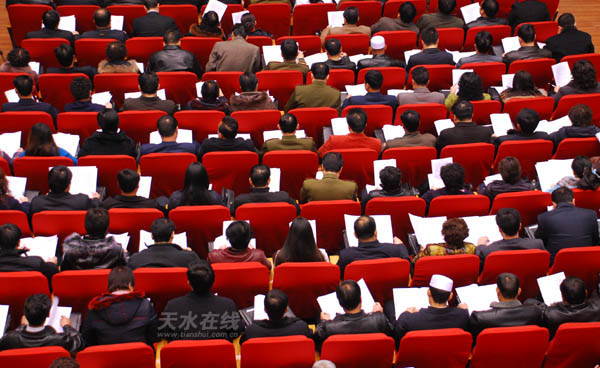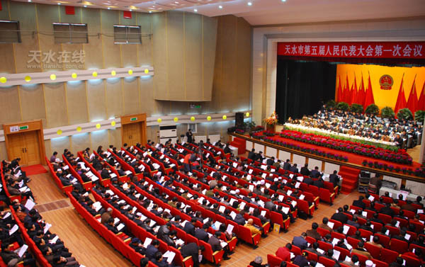 會(huì)場(chǎng)內(nèi)華燈璀璨,生機(jī)盎然,洋溢著莊嚴(yán)、熱烈、民主、團(tuán)結(jié)、奮進(jìn)的氣氛。巨大的國(guó)徽懸掛在主席臺(tái)帷幕中央,兩旁排列著鮮艷的紅旗。代表們滿懷豪情,在這里共同謀劃在新的起點(diǎn)上實(shí)現(xiàn)天水崛起的發(fā)展大計(jì),譜寫和諧天水的新篇章。