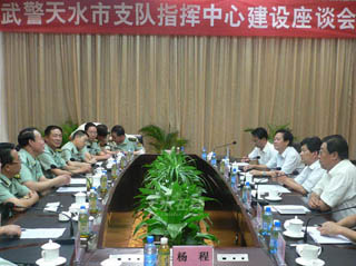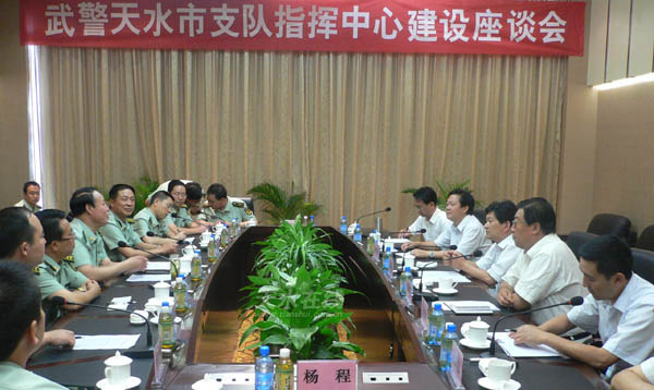 8月16日下午,省武警總隊(duì)政委傅永照、市委書記虞海燕、市委副書記宋敬國、副市長楊維俊以及武警天水支隊(duì)等單位的負(fù)責(zé)人在天水賓館就武警天水支隊(duì)指揮中心建設(shè)事宜進(jìn)行了座談。