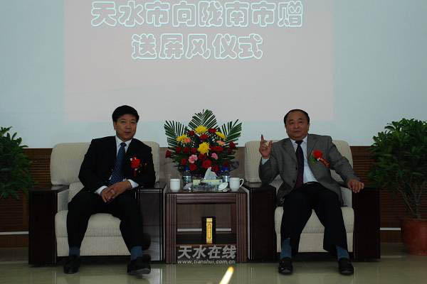 市領(lǐng)導(dǎo)張廣智、郭奇若代表天水市委、市政府向隴南市贈送麥積山圖案屏風(fēng)一面,表達(dá)了對隴南人民的深情厚意。