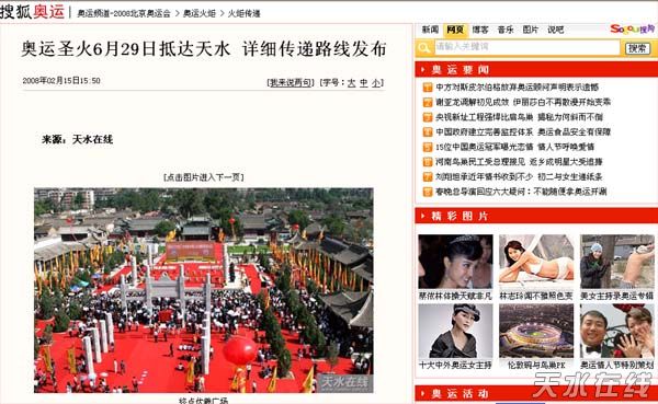 天水在線(xiàn)訊 正月初九(2月15日)中午,天水在線(xiàn)發(fā)布了“奧運(yùn)圣火天水傳遞路線(xiàn)發(fā)布”的新聞,該新聞一經(jīng)發(fā)布,即受到各大網(wǎng)站的高度關(guān)注。新華網(wǎng)、中國(guó)網(wǎng)、搜狐、新浪、CCTV等網(wǎng)站紛紛進(jìn)行轉(zhuǎn)載,新浪更在首頁(yè)進(jìn)行推薦,搜狐網(wǎng)站在其奧運(yùn)頻道作為焦點(diǎn)新聞進(jìn)行了報(bào)道。