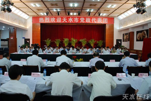 天水黨政代表團(tuán)一行與咸陽市黨政主要領(lǐng)導(dǎo)及相關(guān)部門負(fù)責(zé)人座談時(shí),市委書記、市人大常委會(huì)主任張景輝和市長李文卿與咸陽市委書記、市人大常委會(huì)主任千軍昌,市長莊長興等領(lǐng)導(dǎo)認(rèn)為:建設(shè)“關(guān)中—天水經(jīng)濟(jì)區(qū)”,對天水與咸陽兩市進(jìn)一步擴(kuò)大合作、加深友誼提供了難得的歷史機(jī)遇,天水與咸陽市要以更加創(chuàng)新的思維、務(wù)實(shí)的精神、有效的舉措,深化區(qū)域合作,健全體制機(jī)制,實(shí)現(xiàn)互惠共贏。他們表示:今后,要在共同爭取國家對“關(guān)中—天水經(jīng)濟(jì)區(qū)”的政策支持、加強(qiáng)基礎(chǔ)設(shè)施對接、推進(jìn)產(chǎn)業(yè)協(xié)作配套、深化旅游開發(fā)合作、共同開展以渭河為主要流域的環(huán)保行動(dòng)、建立區(qū)域協(xié)調(diào)機(jī)制等方面進(jìn)行富有成效的交流與協(xié)作,用實(shí)際行動(dòng),為加快“關(guān)中—天水經(jīng)濟(jì)區(qū)”建設(shè)做出應(yīng)有的貢獻(xiàn)。