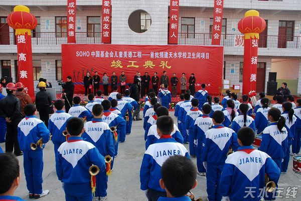 天水市“兒童美德工程”是由潘石屹先生的SOHO中國基金會提出并實施的兒童美德教育工程項目。該項目旨在提升兒童的美德修養(yǎng),挖掘兒童的美德潛能,展示兒童的美德品質(zhì),從小樹立服務(wù)社會的遠大志向。通過在農(nóng)村建設(shè)高標(biāo)準(zhǔn)的衛(wèi)生間,培養(yǎng)農(nóng)村小學(xué)學(xué)生講衛(wèi)生、講文明的良好生活習(xí)慣,促進兒童健康成長,使兒童養(yǎng)成健康文明的優(yōu)良品質(zhì)。其次,通過對教師進行美德課程培訓(xùn),給天水培養(yǎng)一批優(yōu)秀的小學(xué)德育教師,形成一支技能優(yōu)良、方法靈活,教育效果顯著的德育教育教師隊伍。目前,我市已有40名教師在北京進行了為期20天的培訓(xùn);首批援建試點工程、總投資183萬元的10所水沖式學(xué)校廁所也全部完工。