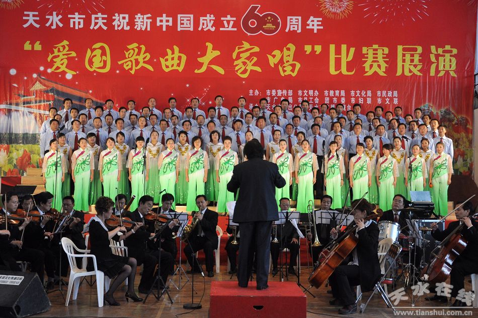 9月25日下午,由天水市委宣傳部、市文明辦、市教育局、市文化局、市民政局、市廣電局、市總工會(huì)、團(tuán)市委、市婦聯(lián)、市文聯(lián)聯(lián)合主辦,天水市演出公司、天水市廣播電視臺(tái)承辦的天水市慶祝新中國(guó)成立60周年“愛國(guó)歌曲大家唱”比賽展演決賽在天水市南山體育館隆重上演。