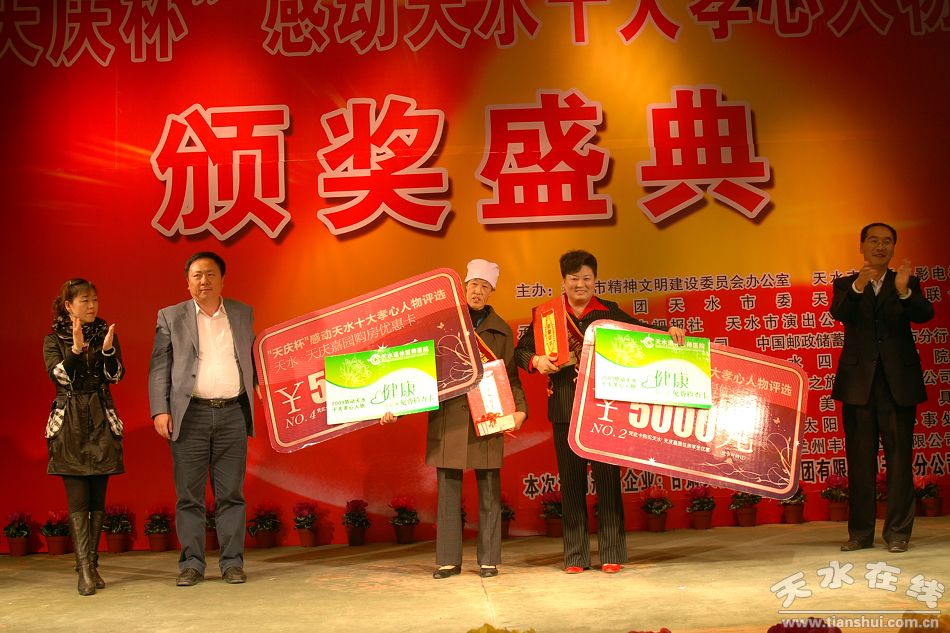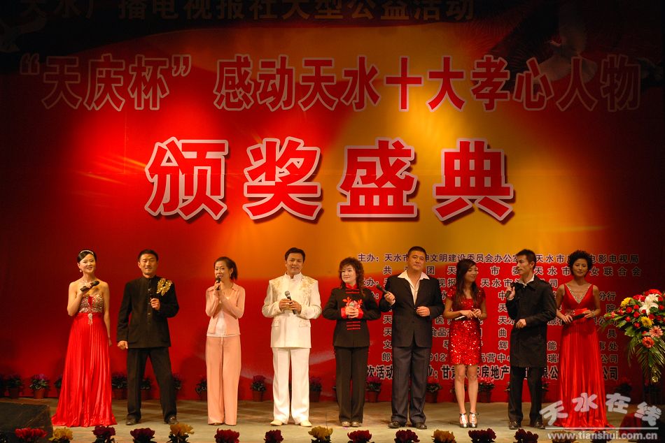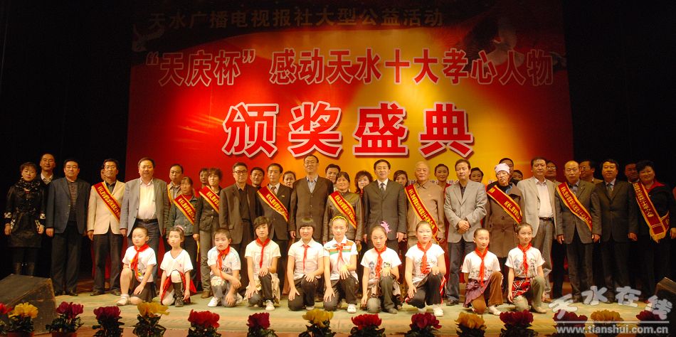 為樹立孝老敬老楷模,倡導(dǎo)敬老養(yǎng)老的中華民族傳統(tǒng)美德,由天水市廣播電影電視局、天水市文明辦、天水市婦女聯(lián)合會(huì)、共青團(tuán)天水市委主辦,天水廣播電視報(bào)社承辦,天慶集團(tuán)天水分公司獨(dú)家冠名的“天慶杯”感動(dòng)天水十大孝心人物評選活動(dòng)自今年7月初開始至今歷時(shí)三個(gè)月之久,在社會(huì)各界中引起強(qiáng)烈反響,取得巨大成功,評選結(jié)果于上周揭曉公布。