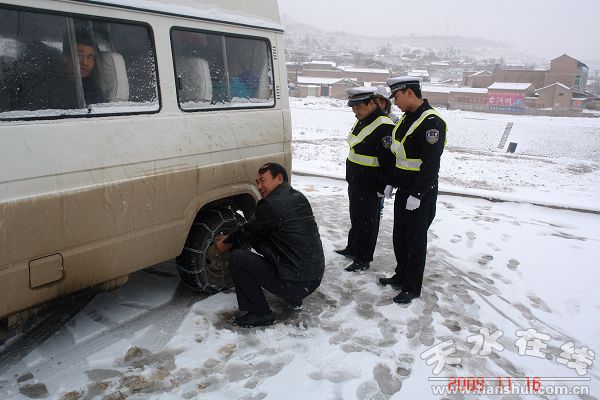 天水交警支隊(duì)針對此次降雪,立即啟動了應(yīng)急預(yù)案,全警動員,全員上路。16日早8時(shí),天水交警支隊(duì)召開緊急會議,抽調(diào)40人組成8個(gè)檢查組,由支隊(duì)領(lǐng)導(dǎo)親自帶隊(duì),分別深入到兩區(qū)五縣主要路段進(jìn)行檢查,督促落實(shí)各項(xiàng)雪天道路交通安全保障措施:一是協(xié)調(diào)寶雞、隴南、平?jīng)、定西等相鄰公安交警部門,對310和316國道及5條省道進(jìn)行交通管制,嚴(yán)禁所有7座以上客運(yùn)車輛通行。督促其它類型車輛及時(shí)安裝防滑鏈,并攜帶三角枕木等防滑設(shè)施后慢速通行;二是協(xié)調(diào)交通、運(yùn)管和公路等部門,調(diào)整客運(yùn)班車運(yùn)行時(shí)間及線路,及時(shí)清除危險(xiǎn)路段冰雪,鋪撒防滑沙,確保行車安全;三是做好路面冰雪融化通車后道路交通安全管理,加大路面監(jiān)控,嚴(yán)禁客車超員,預(yù)防道路交通事故的發(fā)生,確保人民群眾生命財(cái)產(chǎn)安全。