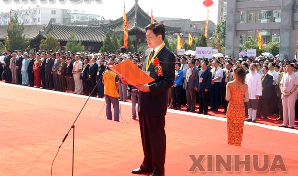 (圖為2007年公祭伏羲大典現(xiàn)場,甘肅省人民政府省長徐守盛同志恭讀祭文)