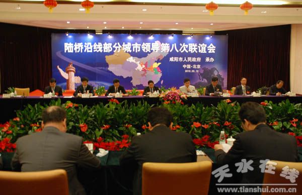 3月12日下午,由咸陽(yáng)市承辦的亞歐大陸橋沿線城市領(lǐng)導(dǎo)第八次聯(lián)誼活動(dòng)在京召開(kāi)。來(lái)自亞歐大陸橋沿線17個(gè)城市的領(lǐng)導(dǎo),本著“合作、共贏、發(fā)展”的主題聚首北京,為進(jìn)一步促進(jìn)陸橋經(jīng)濟(jì)帶的繁榮,推動(dòng)我國(guó)區(qū)域經(jīng)濟(jì)協(xié)調(diào)發(fā)展,暢敘合作友誼,共謀發(fā)展大計(jì)。天水市委副書記、市長(zhǎng)李文卿和副市長(zhǎng)趙衛(wèi)東代表天水市出席聯(lián)誼活動(dòng)。
