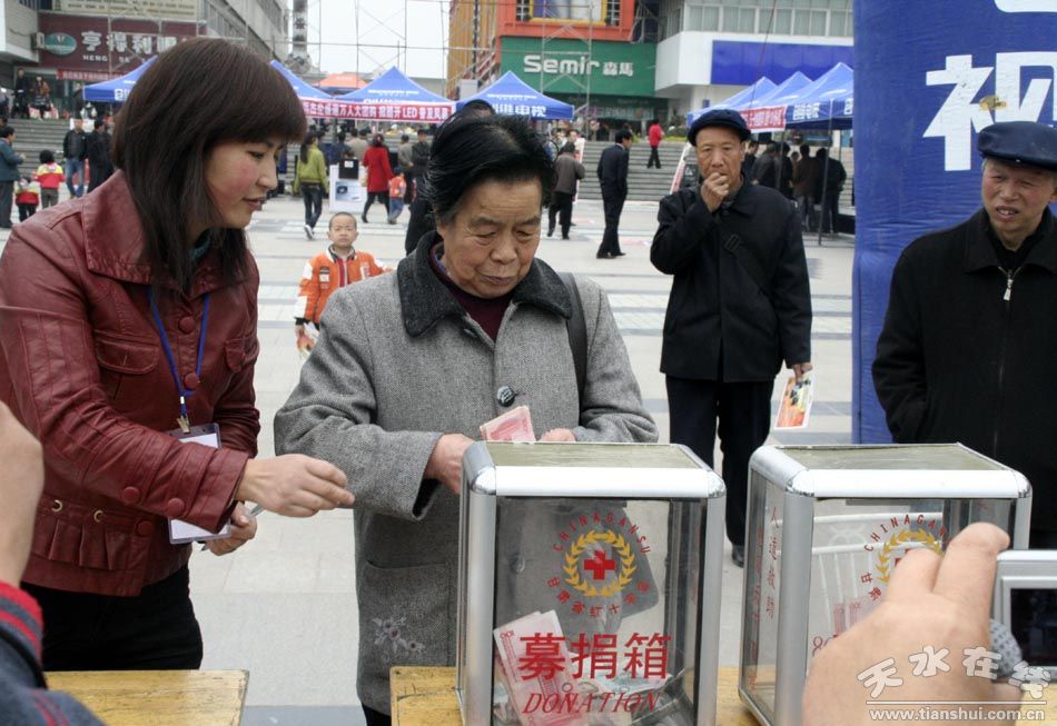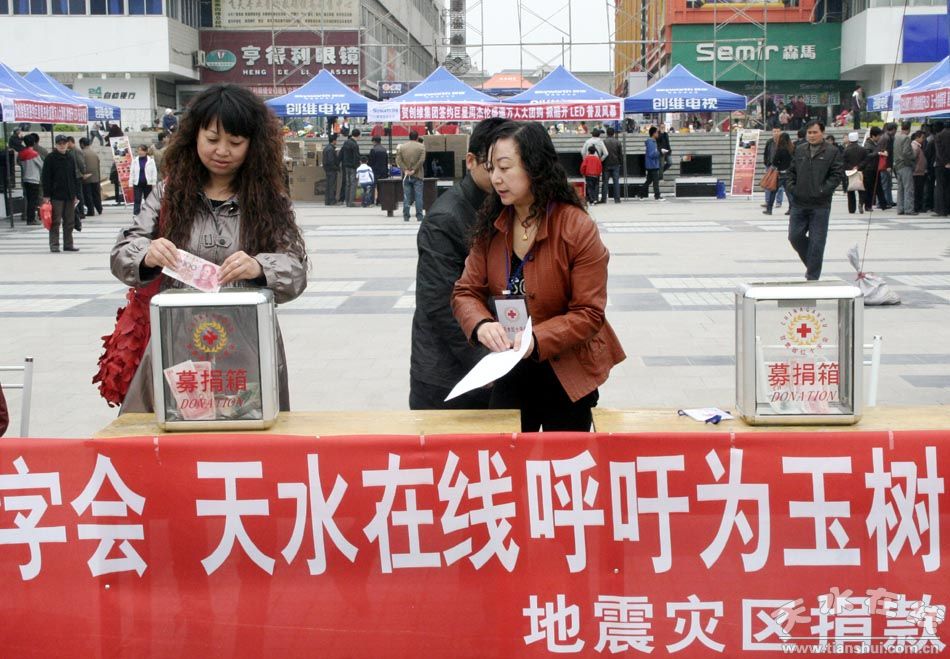 4月17日,由天水市紅十字會、天水在線發(fā)起的為玉樹地震災區(qū)現(xiàn)場募捐活動在市中心廣場舉行。
