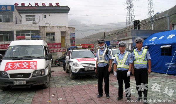 天水交警到達舟曲縣城后即刻開展工作,對縣城入口至舟曲特大泥石流災害總指揮部所在地路段的臨時停放車輛進行了清理。隨后,按照交通指揮部警力部署,對救災物資轉運站、省水利廳災區(qū)生活用水供水點、救災專用加油站、中央電視臺和甘肅電視臺舟曲駐地、北濱河路水位已降部分路段實施交通管控,經過參戰(zhàn)隊員的不懈努力,使得上述點段交通秩序明顯好轉,各種車輛通行有序。