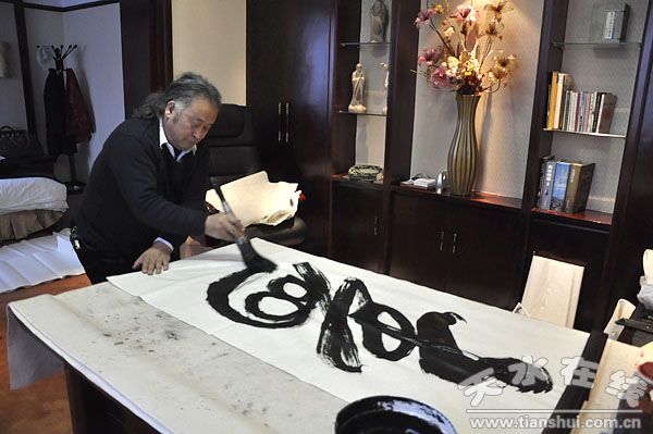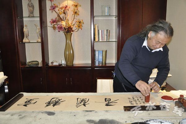 1月11日下午,天水籍中國國際書畫藝術協(xié)會理事會副主席蘇波先生在下榻的迎賓館為天水友人揮毫潑墨。