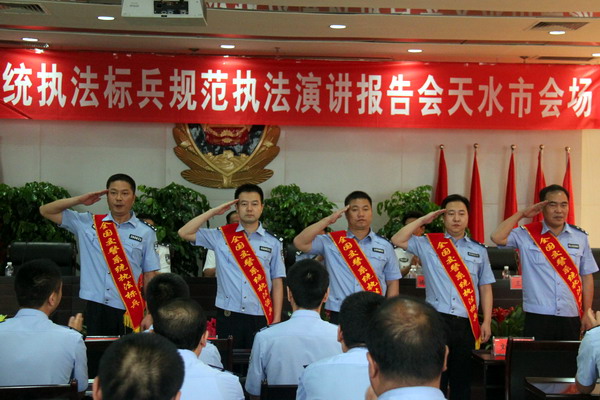 18日上午9時(shí),隨著莊嚴(yán)的《人民警察之歌》奏響,全國交警系統(tǒng)執(zhí)法標(biāo)兵規(guī)范執(zhí)法宣講報(bào)告會(huì)在天水交警支隊(duì)八樓會(huì)議室隆重召開。報(bào)告會(huì)由宣講團(tuán)團(tuán)長(zhǎng)、廳交管局王敏書記主持。支隊(duì)政委楊金生代表天水交警對(duì)宣講團(tuán)的到來表示熱烈歡迎和誠摯感謝,并號(hào)召全市廣大交通民警及協(xié)管員向報(bào)告團(tuán)成員認(rèn)真學(xué)習(xí),以優(yōu)異成績(jī)迎接黨的十八大召開。來自湖南吉首市公安局交警大隊(duì)矮寨中隊(duì)中隊(duì)長(zhǎng)吳浩、海南?谑泄簿纸痪ш(duì)事故處理大隊(duì)民警林海生、湖北省公安廳交警總隊(duì)高管支隊(duì)十堰大隊(duì)大隊(duì)長(zhǎng)王進(jìn)、廣西柳州市公安局交警支隊(duì)事故處理大隊(duì)四中隊(duì)中隊(duì)長(zhǎng)邵立、廣東揭陽市公安局交警支隊(duì)機(jī)動(dòng)巡邏大隊(duì)四中隊(duì)隊(duì)長(zhǎng)林濤5名全國交警系統(tǒng)執(zhí)法標(biāo)兵,分別從規(guī)范執(zhí)法、便民服務(wù)、事故處理、警衛(wèi)護(hù)衛(wèi)等方面介紹了工作經(jīng)驗(yàn),宣講了先進(jìn)事跡。