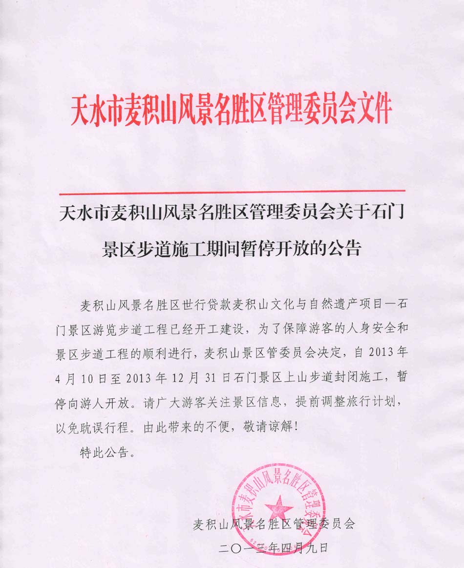 麥積山管委會關(guān)于石門步道施工期間暫停開放的公告
