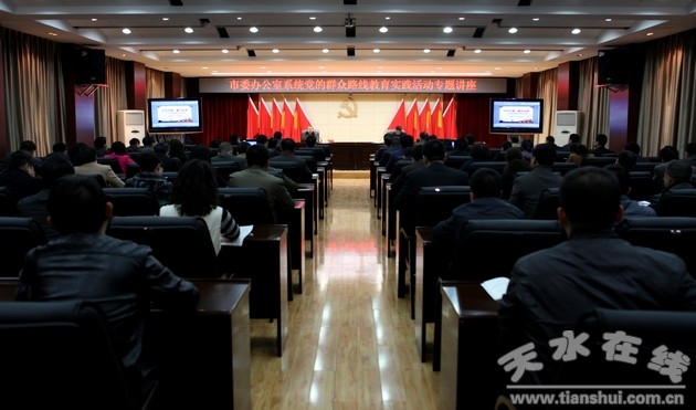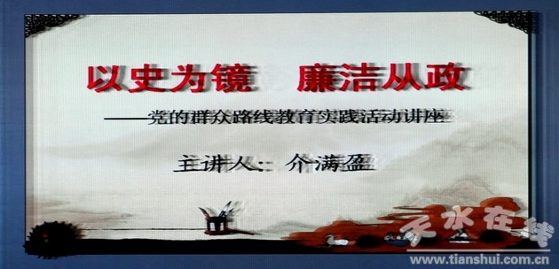 為進(jìn)一步深入推進(jìn)黨的群眾路線教育實(shí)踐活動(dòng),切實(shí)提高黨委辦公系統(tǒng)黨員干部的宗旨意識(shí)和群眾觀念,3月13日下午,天水市委辦公室邀請(qǐng)?zhí)焖腥舜蟪N瘯?huì)原副主任介滿盈為市委辦公室系統(tǒng)黨員干部作了題為《以史為鏡、廉潔從政》的專題輔導(dǎo)講座。