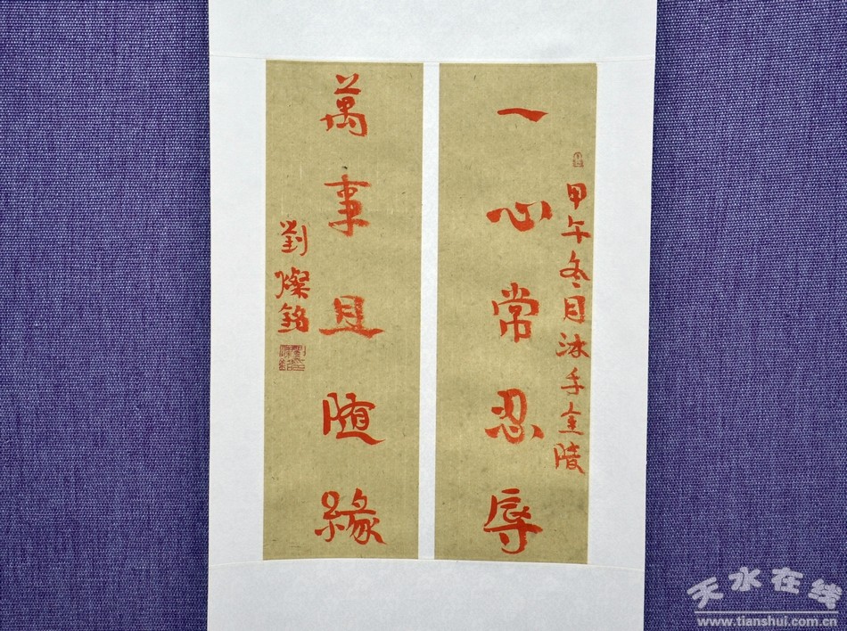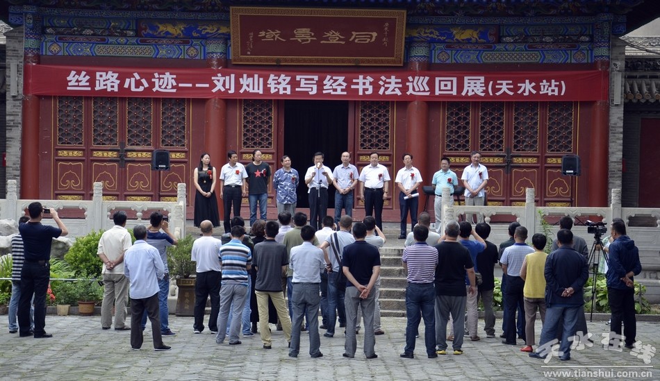 6月26日上午,由江蘇省文學(xué)藝術(shù)聯(lián)合會(huì)、東南大學(xué)、江蘇省書(shū)法家協(xié)會(huì)、陜西省書(shū)法家協(xié)會(huì)、甘肅省書(shū)法家協(xié)會(huì)、青海省書(shū)法家協(xié)會(huì)、現(xiàn)代快報(bào)社、南京華衣集團(tuán)主辦的“絲路心跡——?jiǎng)N銘寫(xiě)經(jīng)書(shū)法巡回展”(天水站)在天水美術(shù)館隆重開(kāi)幕,此次展覽是繼西安、平?jīng)龊笱不卣沟牡谌。出席開(kāi)幕式的嘉賓有天水市政府副市長(zhǎng)溫利平,天水市委宣傳部副部長(zhǎng)趙子洲,天水市文學(xué)藝術(shù)界聯(lián)合會(huì)主席王進(jìn)文,美尼德文化投資(北京)有限公司董事長(zhǎng)仇志宏,敦煌起點(diǎn)藝術(shù)有限公司張靜茜。與著名書(shū)法家曾翔、李強(qiáng)兩位先生緣遇天水,應(yīng)邀參與了開(kāi)幕式。開(kāi)幕式上,劉燦銘先生向天水市書(shū)畫(huà)院捐贈(zèng)了書(shū)法作品。