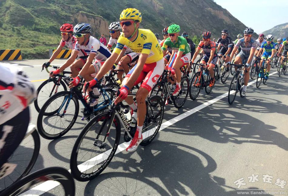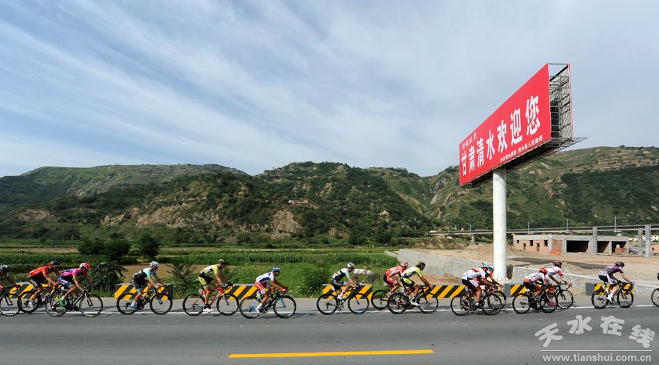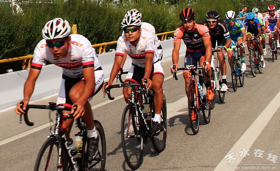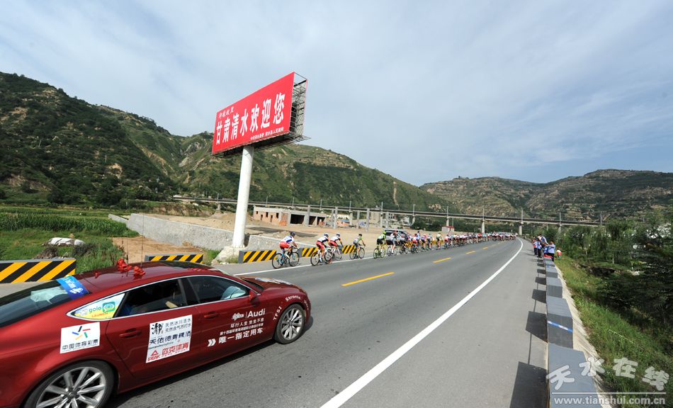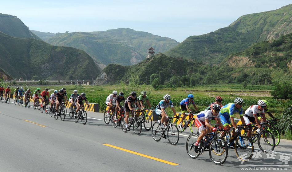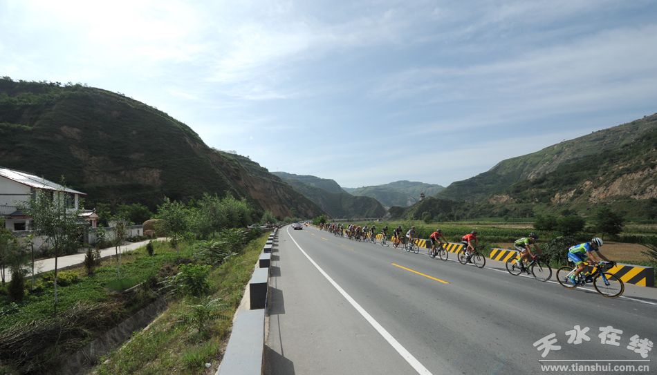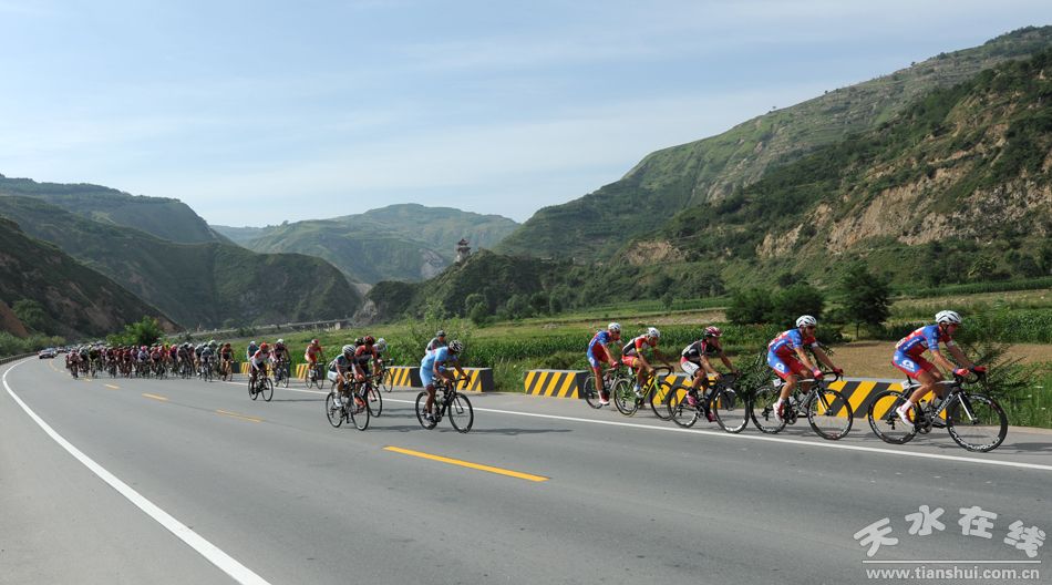 天水在線現(xiàn)場報(bào)道 7月16日上午,2015第十四屆“青海農(nóng)信杯”環(huán)青海湖國際公路自行車賽進(jìn)入第十一賽段天水至平?jīng)龉焚。比賽從麥積區(qū)龍園門口出發(fā),通過渭河二號(hào)橋、渭濱北路,再經(jīng)清水縣紅堡鎮(zhèn)、黃門鄉(xiāng),張家川縣劉堡鄉(xiāng)、張棉驛鄉(xiāng),平?jīng)鍪腥A亭縣,最后到達(dá)平?jīng)鍪嗅轻脊沛?zhèn)廣場,天水市境內(nèi)96公里。