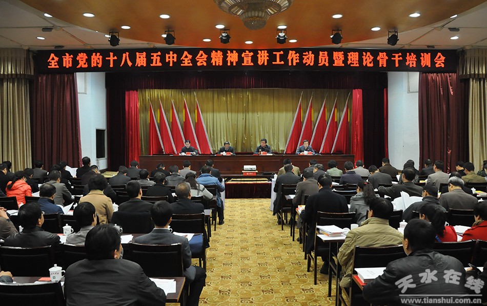 會議傳達了全國學(xué)習(xí)貫徹黨的十八屆五中全會精神研討班精神和全省黨的十八屆五中全會精神宣講動員暨理論骨干培訓(xùn)會精神,宣讀了《天水市開展黨的十八屆五中全會精神宣講工作方案》,安排部署全市黨的十八屆五中全會精神宣講工作。根據(jù)省委宣講工作總體安排,市委將選調(diào)政治素質(zhì)強、理論政策水平高的領(lǐng)導(dǎo)干部、理論工作者,組成市委宣講團,分設(shè)7個組將深入我市縣區(qū)、高校、企業(yè)開展宣講,市級學(xué)習(xí)宣講活動從11月下旬開始,12月底前結(jié)束;縣區(qū)、鄉(xiāng)鎮(zhèn)(街道)的宣講活動,可根據(jù)實際情況具體安排,在春節(jié)前完成宣講。