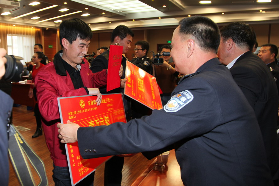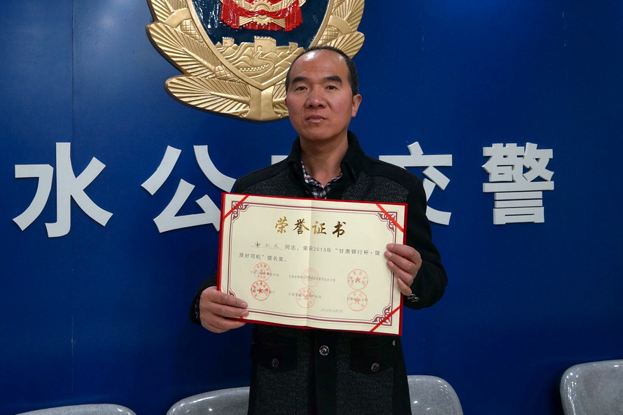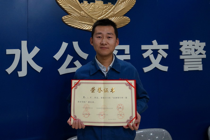 甘谷縣駕駛?cè)死罱ㄜ姭@“甘肅銀行杯·隴原好司機(jī)”榮譽(yù)稱號(hào)及1萬元獎(jiǎng)金,秦州區(qū)駕駛?cè)酥x仁義、惠二龍獲“甘肅銀行杯·隴原好司機(jī)”提名獎(jiǎng)及各5000元獎(jiǎng)金。12月4日上午,天水市公安局交警支隊(duì)舉辦頒獎(jiǎng)儀式,副支隊(duì)長(zhǎng)強(qiáng)亞龍向其二人頒發(fā)了榮譽(yù)證書和獎(jiǎng)金。