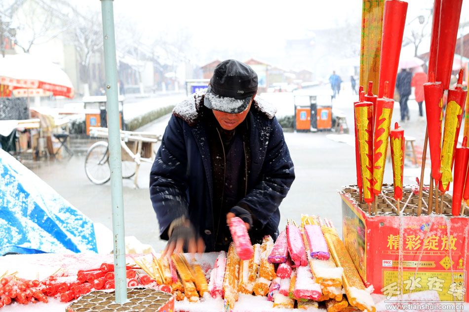 當(dāng)日,天水市出現(xiàn)雨雪天氣,紛紛揚揚的大雪落在大紅的燈籠上,好看極了。雪花伴著燈籠,使天水城出現(xiàn)了“雪打燈”景象。正是正月十五“雪打燈”,當(dāng)年定是好收成”(傳統(tǒng)的元宵節(jié)指正月十四日至十六日)。