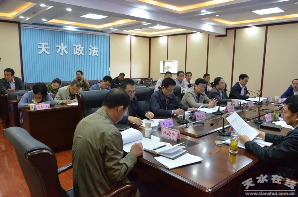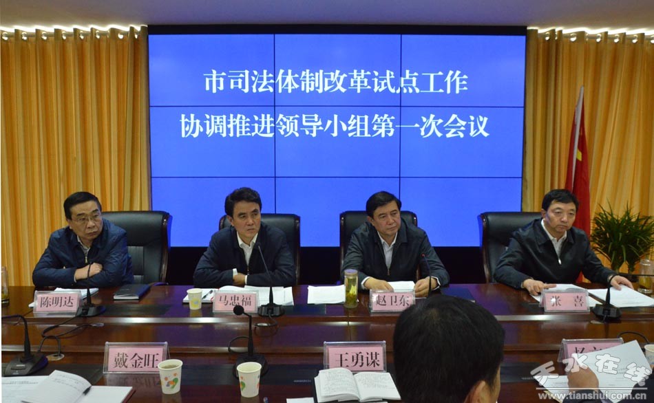 5月16日,天水市委常委、政法委書(shū)記趙衛(wèi)東主持召開(kāi)全市司法體制改革試點(diǎn)工作協(xié)調(diào)推進(jìn)領(lǐng)導(dǎo)小組第一次會(huì)議,貫徹落實(shí)中央和省委司法體制改革工作精神,統(tǒng)一思想,明確任務(wù)、靠實(shí)責(zé)任、推動(dòng)全市司法體制改革試點(diǎn)工作。