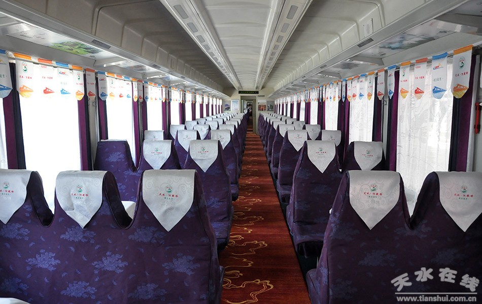 5月15日,天水至敦煌“天水·伏羲號(hào)”環(huán)形旅游列車?guó)Q笛發(fā)車。該趟列車是天水市真正意義上的首趟始發(fā)列車。使用1組25K型車體,列車編組14節(jié),其中軟臥1節(jié)、硬臥6節(jié)、硬座4節(jié)、餐車1節(jié)、行李車1節(jié)、發(fā)電車1節(jié);全程軟臥下鋪票價(jià)497.5元、硬臥下鋪325.5元、硬座177.5元。天水火車站14時(shí)43分始發(fā),途經(jīng)隴西、蘭州、武威、金昌、張掖、嘉峪關(guān)、瓜州站,第二日8時(shí)56分終到敦煌站,單程運(yùn)行里程1481km,用時(shí)18小時(shí)13分鐘,開1天停2天運(yùn)行。