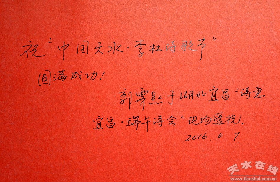 6月7日,在“詩意宜昌·致遠(yuǎn)方”端午詩會會場,應(yīng)天水在線邀請,天水籍名人、秦州大櫻桃”公益代言人、中央電視臺《中華情》總導(dǎo)演、制片人郭霽紅為首屆“中國天水·李杜詩歌節(jié)”題詞,祝賀首屆“中國天水·李杜詩歌節(jié)”取得圓滿成功。