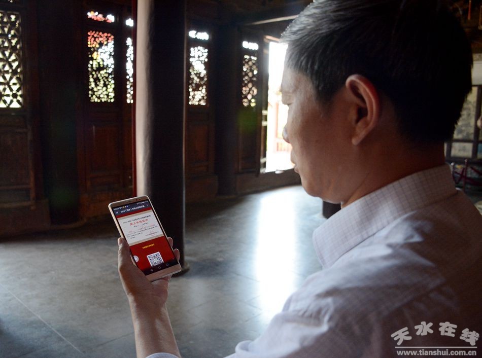 6月17日16時,天水市伏羲廟管理局局長李寧民在伏羲廟先天殿(又稱正殿、大殿)通過手機點擊啟動2016(丙申)年甘肅省公祭中華人文始祖伏羲大典之“網(wǎng)上祭祖”活動。同時,李寧民還登陸“網(wǎng)上祭祖”平臺,向伏羲圣像完成了“明燭、化表、敬酒、獻飯、獻花”議程,平臺自動生成了編碼為“1”的網(wǎng)上祭祖證書,李寧民在朋友圈進行了轉(zhuǎn)發(fā)。
