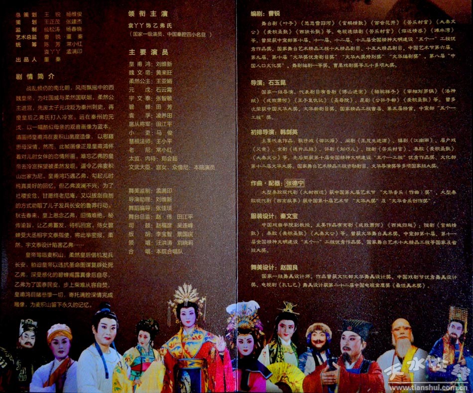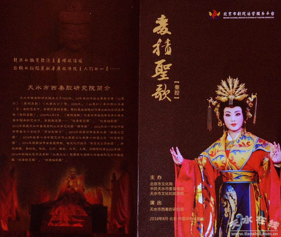 據(jù)悉,本次演出是由北京市文化局主辦的“2016年度北京市劇院運(yùn)營服務(wù)平臺”項目,自5月10日至8月31日之間,以中國評劇大劇院、北京青年劇院、解放軍歌劇院三個劇院為主,為北京廣大市民帶來具有弘揚(yáng)中國優(yōu)秀傳統(tǒng)文化、弘揚(yáng)社會主義核心價值觀,具有較高藝術(shù)水準(zhǔn)的舞臺藝術(shù)作品。2016年計劃200臺劇目,北京院團(tuán)及演出機(jī)構(gòu)演出劇目占總劇目的80%,其他省市院團(tuán)及演出機(jī)構(gòu)演出劇目占總演出劇目的20%,天水市西秦腔研究院精品保留劇《麥積圣歌》有幸入圍演出安排。