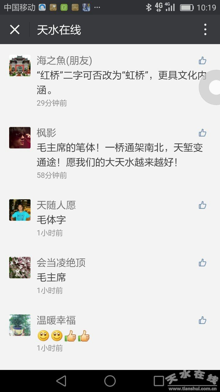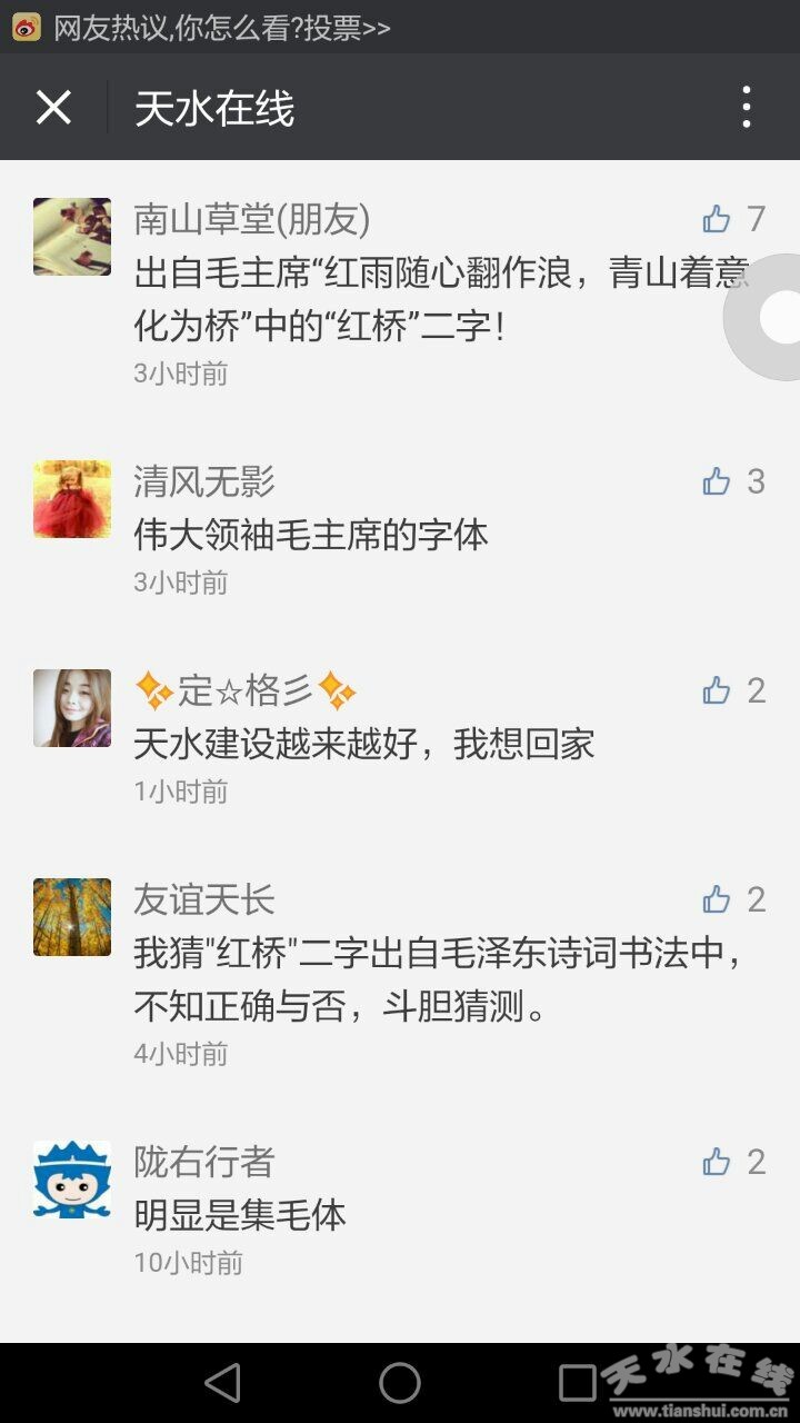 10月24日0時,天水在線微信公眾號發(fā)布了“天水城事 | “紅橋”二字已上橋,猜猜是誰寫的? ”的文章,該文章一經(jīng)發(fā)出,即受到了網(wǎng)友們的圍觀,大家紛紛留言。
