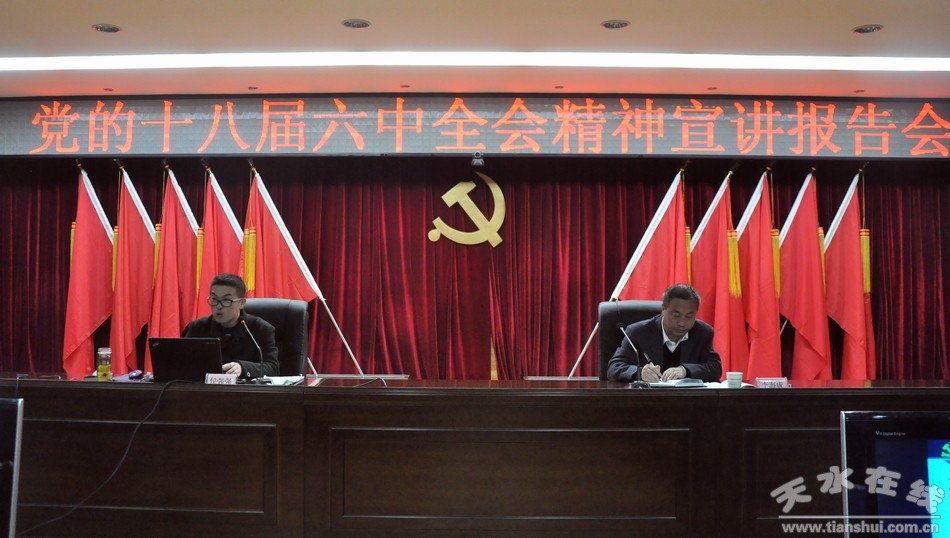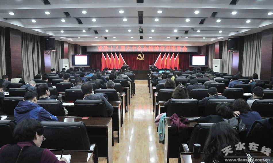 11月18日下午,天水市委辦公室、市委政法委、市直機(jī)關(guān)工委舉行黨的十八屆六中全會精神宣講報告會,邀請市委黨校講師侯強(qiáng)強(qiáng)作了題為《治國必先治黨 治黨務(wù)必從嚴(yán)》的專題輔導(dǎo)。