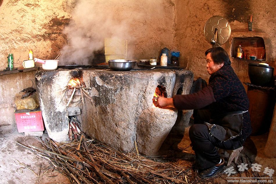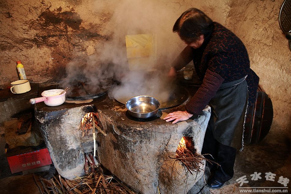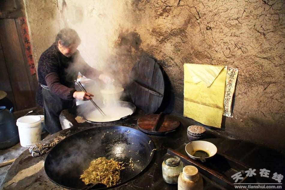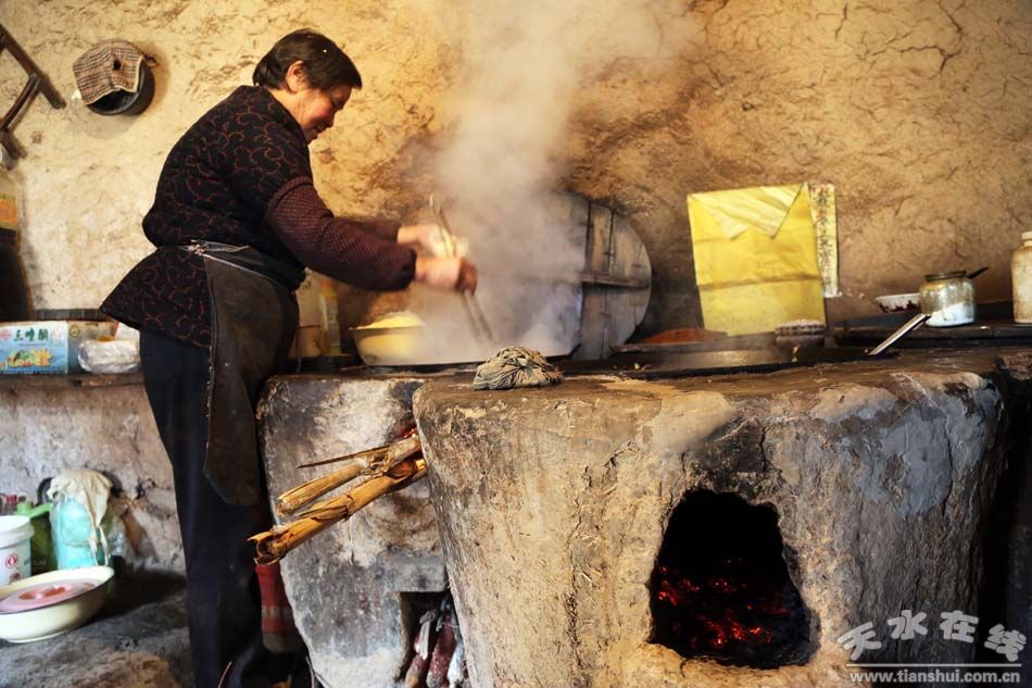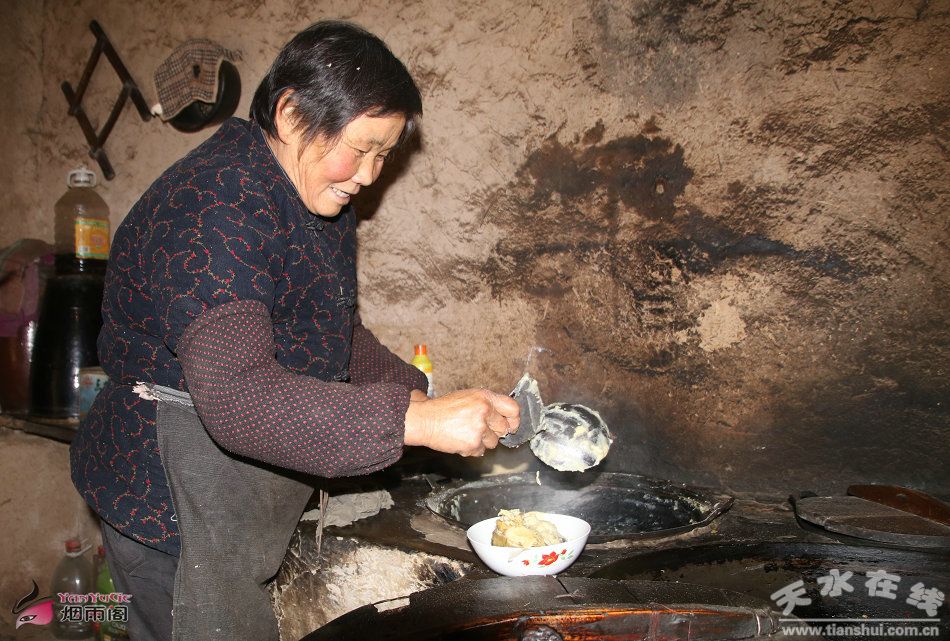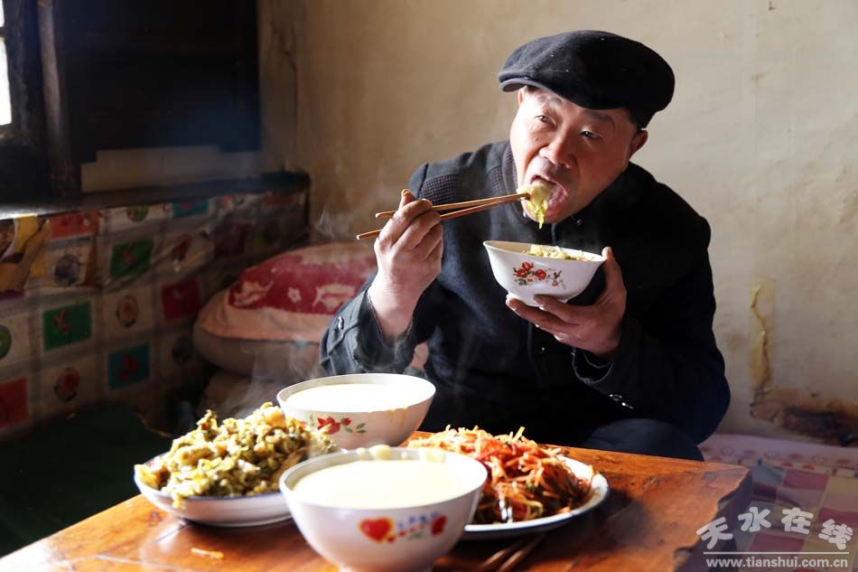 在古老的天水,每當冬季來臨,氣溫一天天下降,時不時的有陣陣冷空氣來襲,在寒冷的日子里,一碗熱乎乎的馓面飯便成為驅(qū)寒暖身的最美佳肴。做馓面飯是一門藝術。以當年的新鮮玉米,用石磨磨成的面最香。做時,先用大火將鐵鍋里的水燒開,然后放進大塊的土豆塊,右手執(zhí)一長竹筷,左手抓適量玉米面邊往鍋里拋灑,一邊灑一邊用竹筷勻速攪動,這時候雙手一定要配合默契,要不然面在鍋里會結成疙瘩,待到稀稠適當,鍋里形成糊狀時,核桃般大的氣泡從鍋里“撲哧撲哧”地往出冒,再用大勺來回攪拌,這時蓋上鍋蓋,用細火慢燉少許時間,一鍋香蓬蓬、伴著新鮮玉米面和土豆特殊香味的馓面飯便出鍋了。 馓飯做熟后,還得有下飯吃的菜,天水人叫“下”菜!跋隆辈说姆N類很多,多可數(shù)十種,少則一兩種,最常見的是炒青椒、炒土豆絲、涼拌胡蘿卜絲、涼拌蘿卜、熗酸菜和各種腌制的泡菜。在麥積區(qū)和清水縣,還有一種特別的“下”菜——“麻菜”,因這里盛產(chǎn)花椒,每年霜降之后,家家將經(jīng)過霜浸過的大白菜和卷心菜放在大鍋里過水后晾涼,一層一層碼在缸中,灑上食鹽和花椒粒,缸口用大小適宜的石頭鎮(zhèn)壓發(fā)酵成熟。一月之后,清脆可口、帶著濃郁椒香味的“麻菜”便制成了,“麻菜炒豆腐”是吃馓飯最好的“下”菜。過去,農(nóng)村生活條件差,冬天的新鮮蔬菜少,一缸“麻菜”就是一家人整個冬天的菜壇子。雨雪天,端上一碗熱乎乎的馓飯,一家人圍坐在炕頭,外面天寒地凍,屋內(nèi)卻熱氣騰騰,溫暖從捂著馓飯碗的手漸漸融化到心里,是多么溫馨的事!吃馓飯也很講究,要從碗邊或中間一筷一筷地撈起,手中的碗要不斷的旋轉(zhuǎn),吃到碗底馓飯都是熱乎乎的,而且吃過的碗特別干凈。外地人不會吃,嫌這樣太麻煩,干脆端起來一喝了之,這可是吃馓飯的大忌,是最煞風景的。