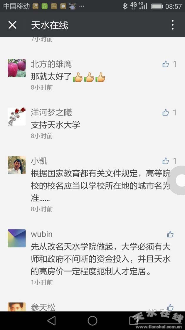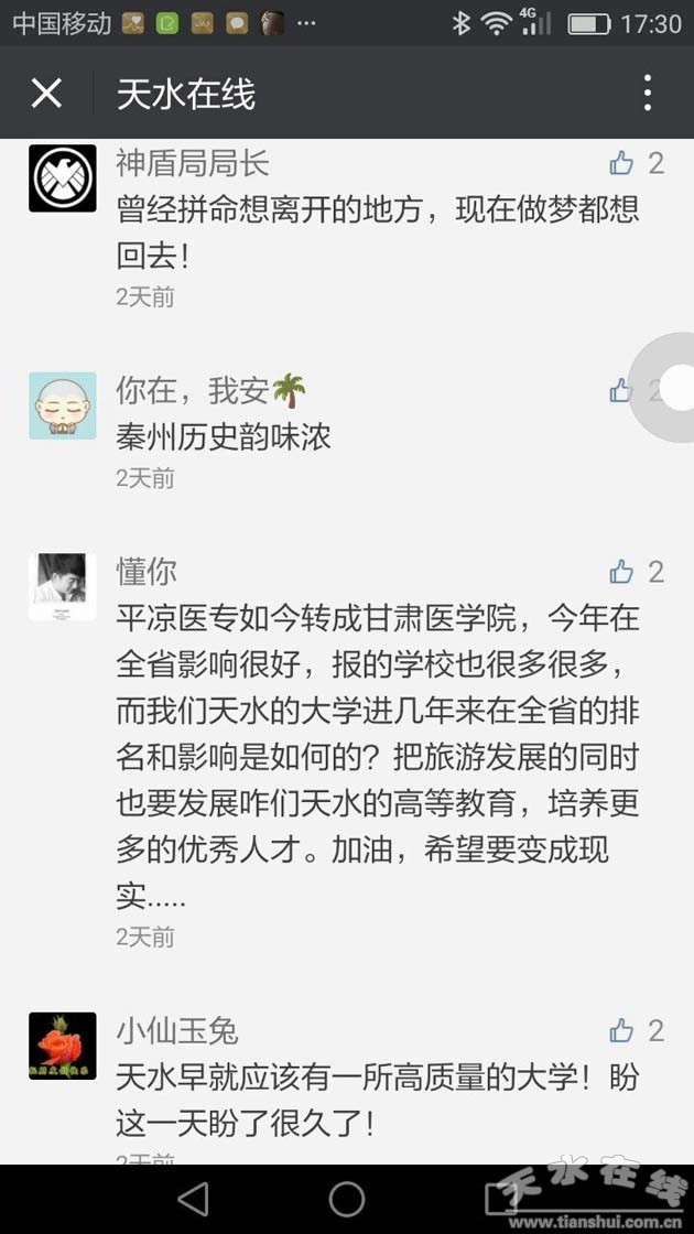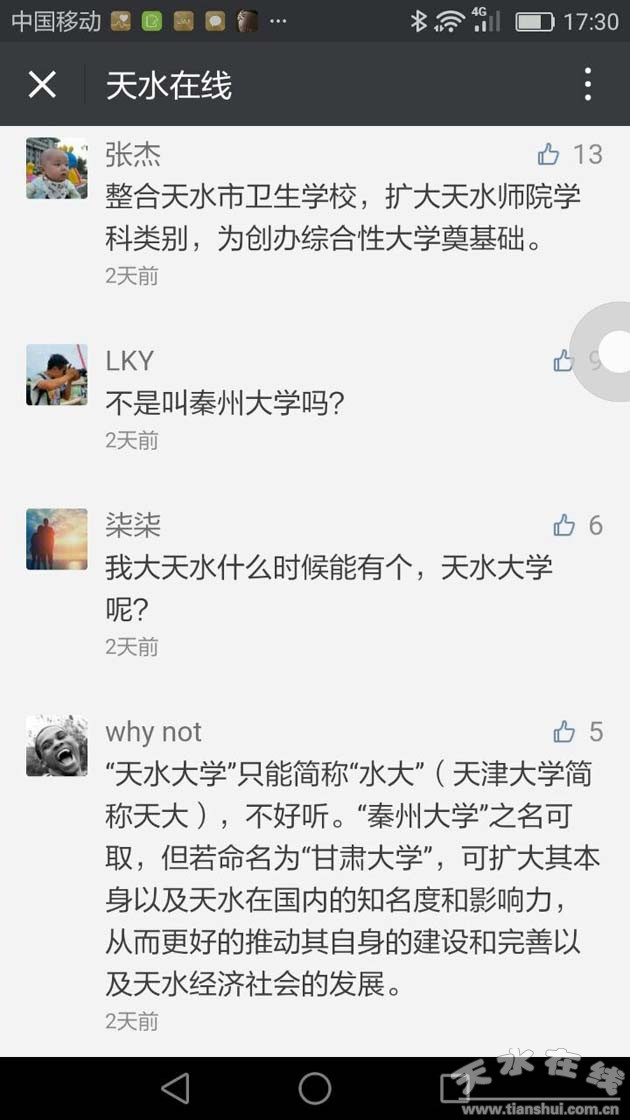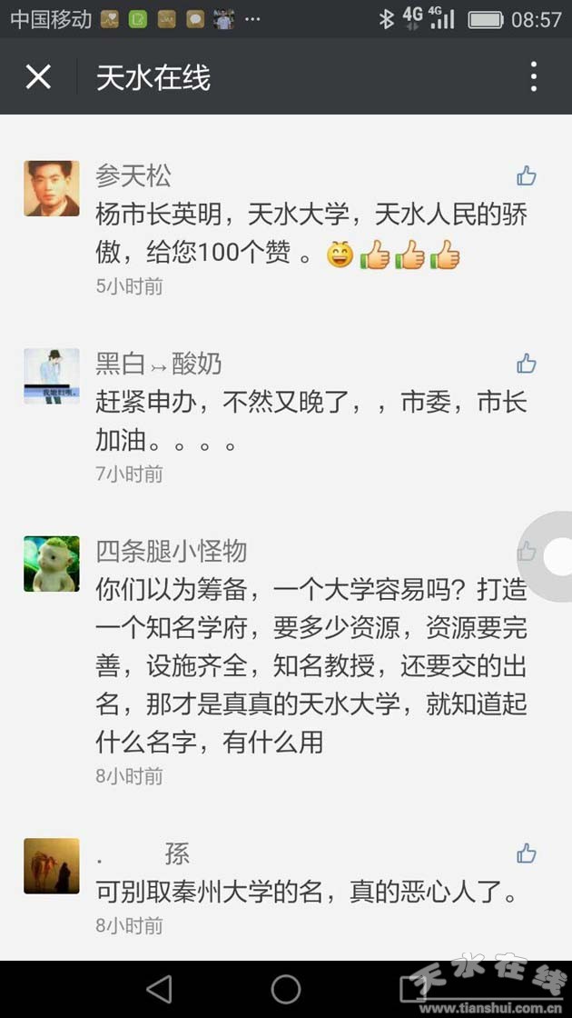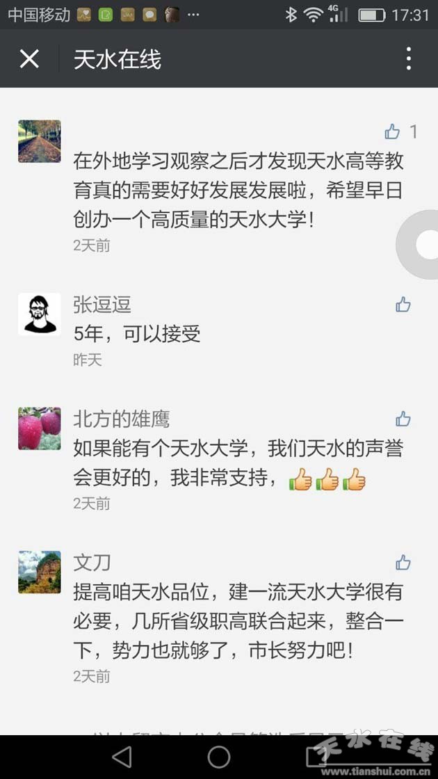 天水在線12月4日報道 天水市委副書記、市長楊維俊11月30日來到天水師范學院,就我市高等教育發(fā)展工作進行調研。楊維俊指出,天水市教育資源豐富,全市有高職學院、普通中專等各級各類院校30多所,工業(yè)、林業(yè)、農業(yè)、醫(yī)學等專業(yè)門類齊全,整合優(yōu)化職業(yè)教育資源、創(chuàng)辦天水大學具有較好基礎,也符合國家關于加快教育改革發(fā)展的政策精神。要結合天水實際,加強與省教育廳等部門的匯報溝通,最大程度地整合優(yōu)化天水高等教育和職業(yè)教育資源,積極探索加快高等教育改革發(fā)展和職業(yè)教育整合優(yōu)化的運行機制和管理模式,為早日創(chuàng)辦天水大學、推動天水高等教育實現更高層次發(fā)展不懈努力。該新聞經天水在線網站和天水在線微信公眾號發(fā)布后,立即引發(fā)網民熱議。現將網民留言發(fā)布如下: