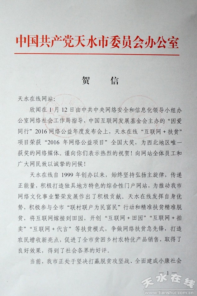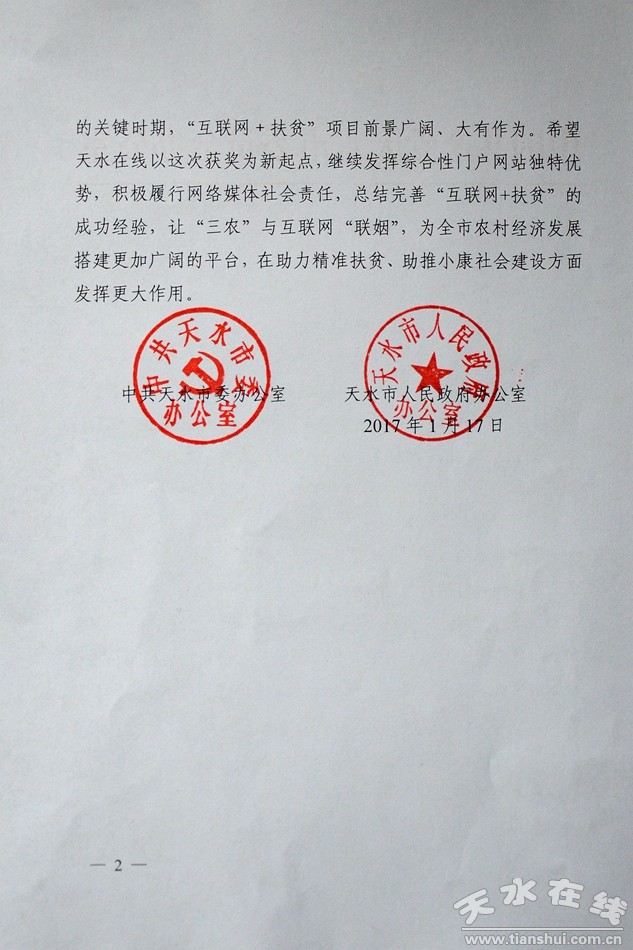 天水市委辦公室市政府辦公室致信祝賀天水在線獲獎(圖)